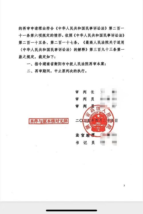富士电梯公司不服,继续组织材料向湖南省高级人民法院提出再审申请,近日湖南省高级人民法院终于作出裁定,认为原审判决适用法律不当,指令湖南省衡阳市中级人民法院再审该案,并裁定中止原判决的执行!至此,案件终于迎来重大转机!