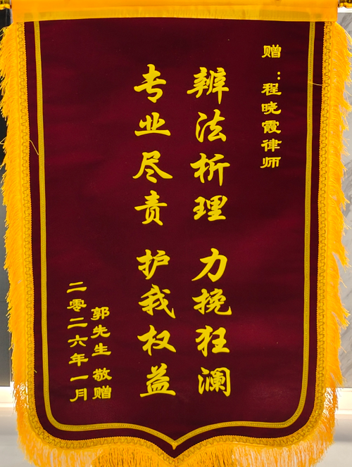 从2021年到2026年,跨越四年多的维权长跑,近日终于画上圆满句号。1月23日,当事人郭先生向我所王朝阳律师、程晓霞律师赠送锦旗,上书“辨法析理,力挽狂澜,专业尽责,护我权益”,感谢两位律师在长达四年多的时间里始终坚守,最终为其挽回全部损失。