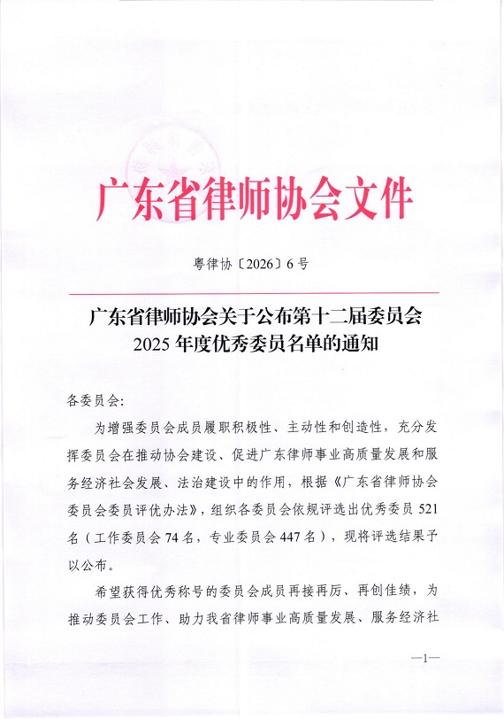 广东省律师协会年度优秀委员评选,是依据《广东省律师协会委员会委员评优办法》开展的行业重要评选活动,旨在表彰在协会委员会工作中履职尽责、积极作为,为推动广东律师事业高质量发展作出重要贡献的委员。评选经各委员会严格遴选、层层审核,最终确定优秀委员名单,这份荣誉不仅是对律师个人专业能力与行业服务的高度肯定,更是对其在专业领域深耕实践、助力行业建设的充分认可。