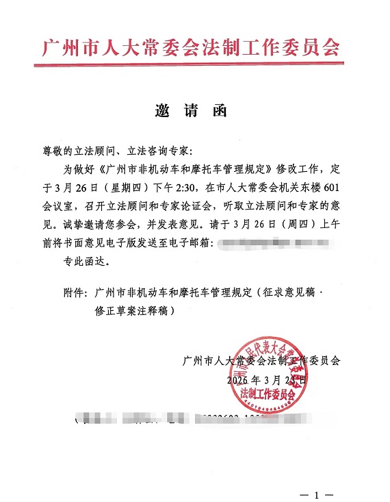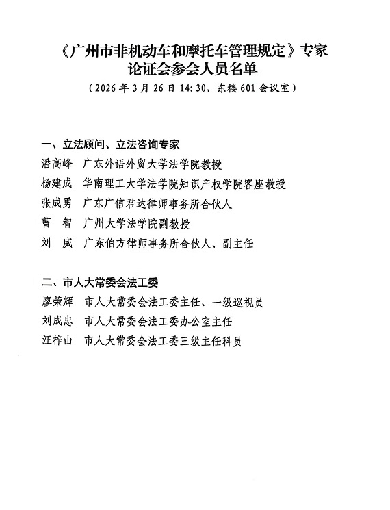 2026年3月26日,广州市人大常委会法制工作委员会召开《广州市非机动车和摩托车管理规定》专家论证会,就该规定的修改工作听取立法顾问与专家意见。广东伯方律师事务所合伙人、副主任刘威律师受邀作为立法咨询专家参会,为地方立法工作贡献专业力量。